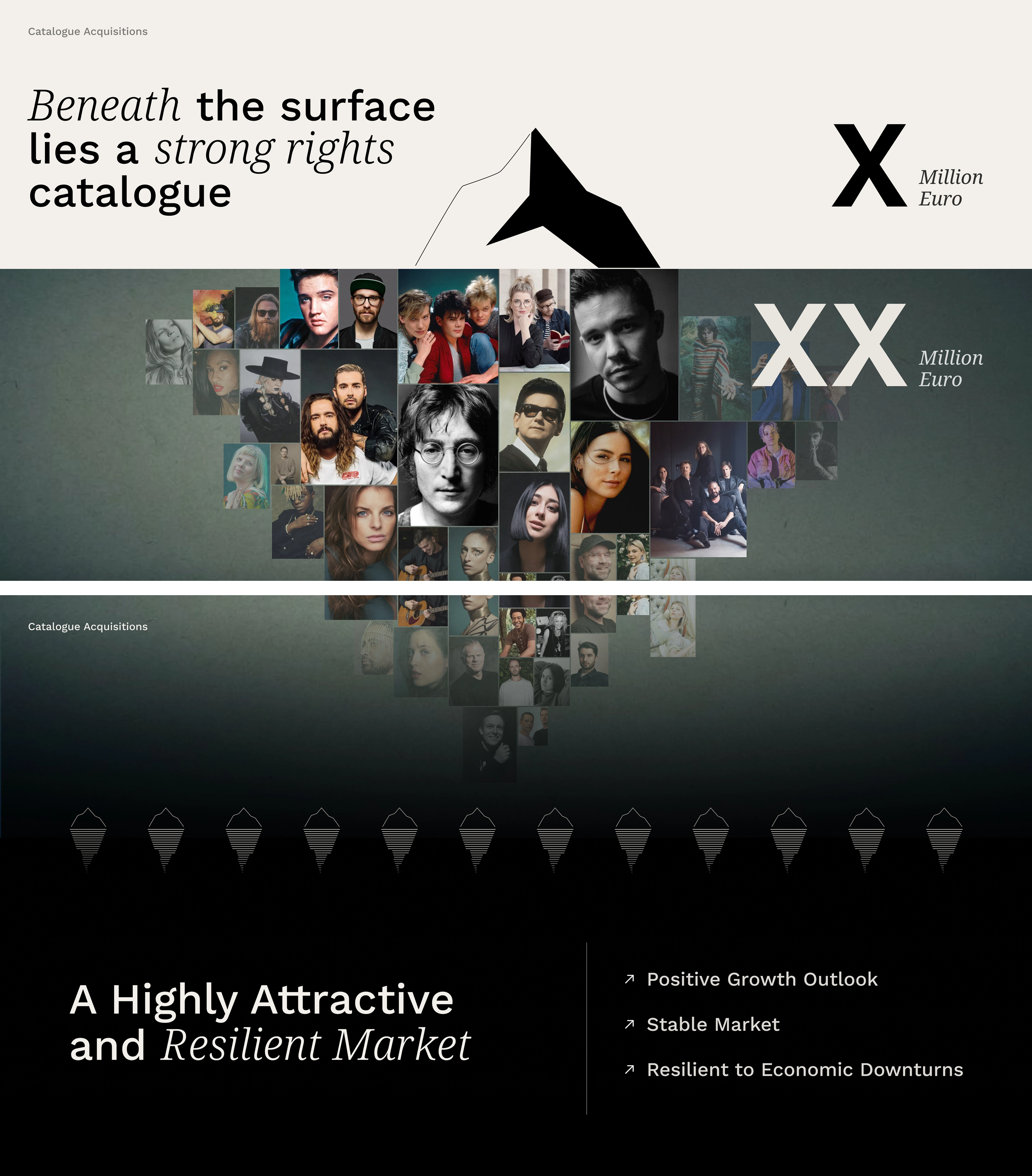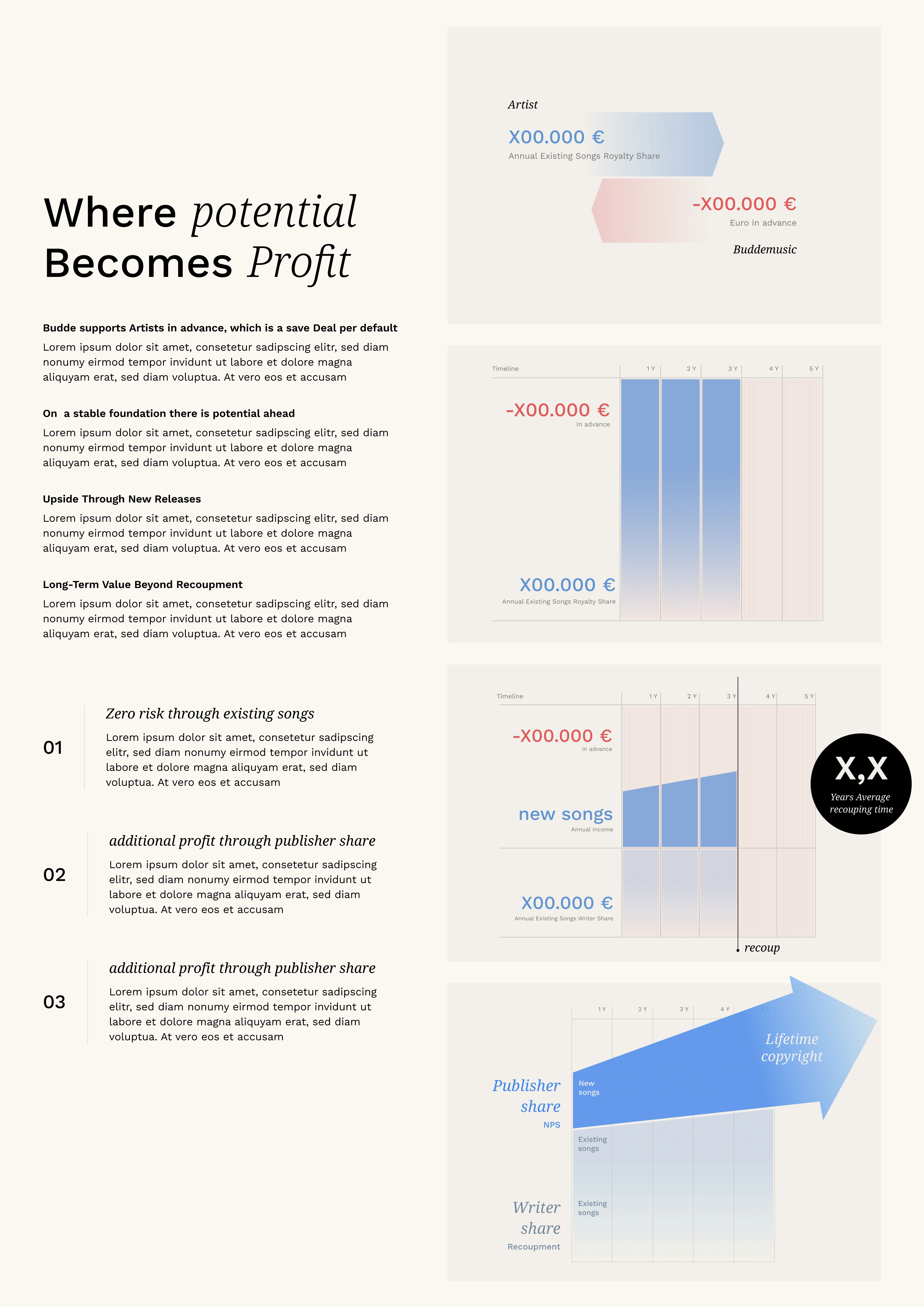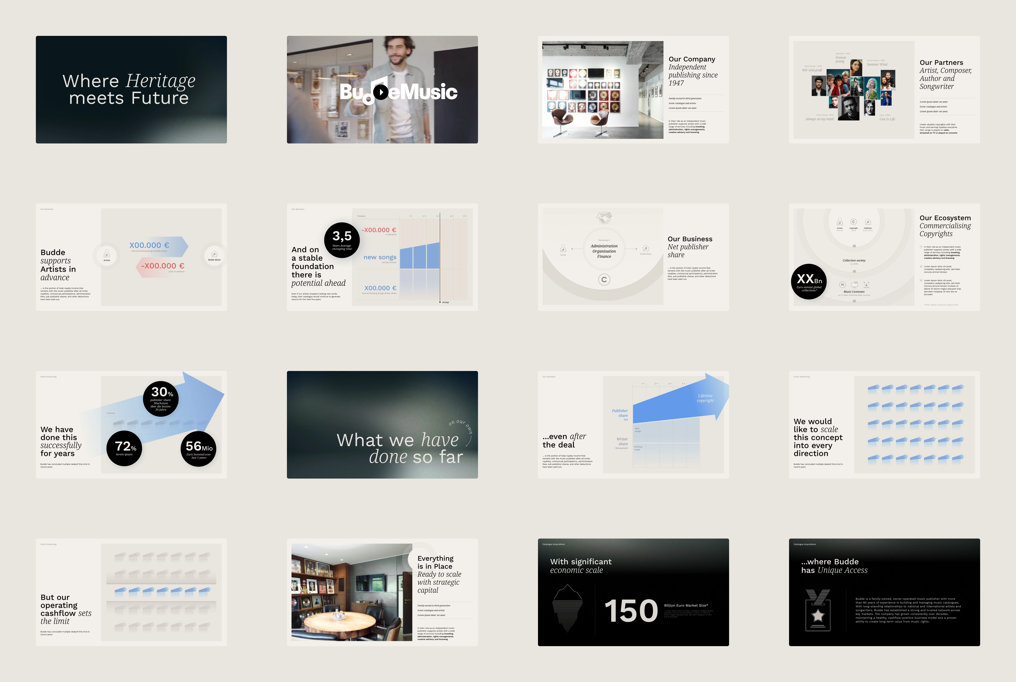 Für BuddeMusic habe ich ein Investor-Pitch-Deck gestaltet und konzeptionell mitentwickelt, das ihr komplexes Geschäftsmodell rund um Musiklizenzierung klar und überzeugend vermittelt. Ziel war es, Inhalte so zu strukturieren und visuell aufzubereiten, dass branchenfremde Investor:innen und Banken das Modell schnell erfassen und die zentralen Vorteile unmittelbar erkennen. Durch eine stringente Storyline, präzise Visualisierungen und eine hochwertige Designsprache wurden Chancen, Differenzierung und Potenzial so kommuniziert, dass die Präsentation Entscheidungsträger gezielt in Richtung Investment führt.
