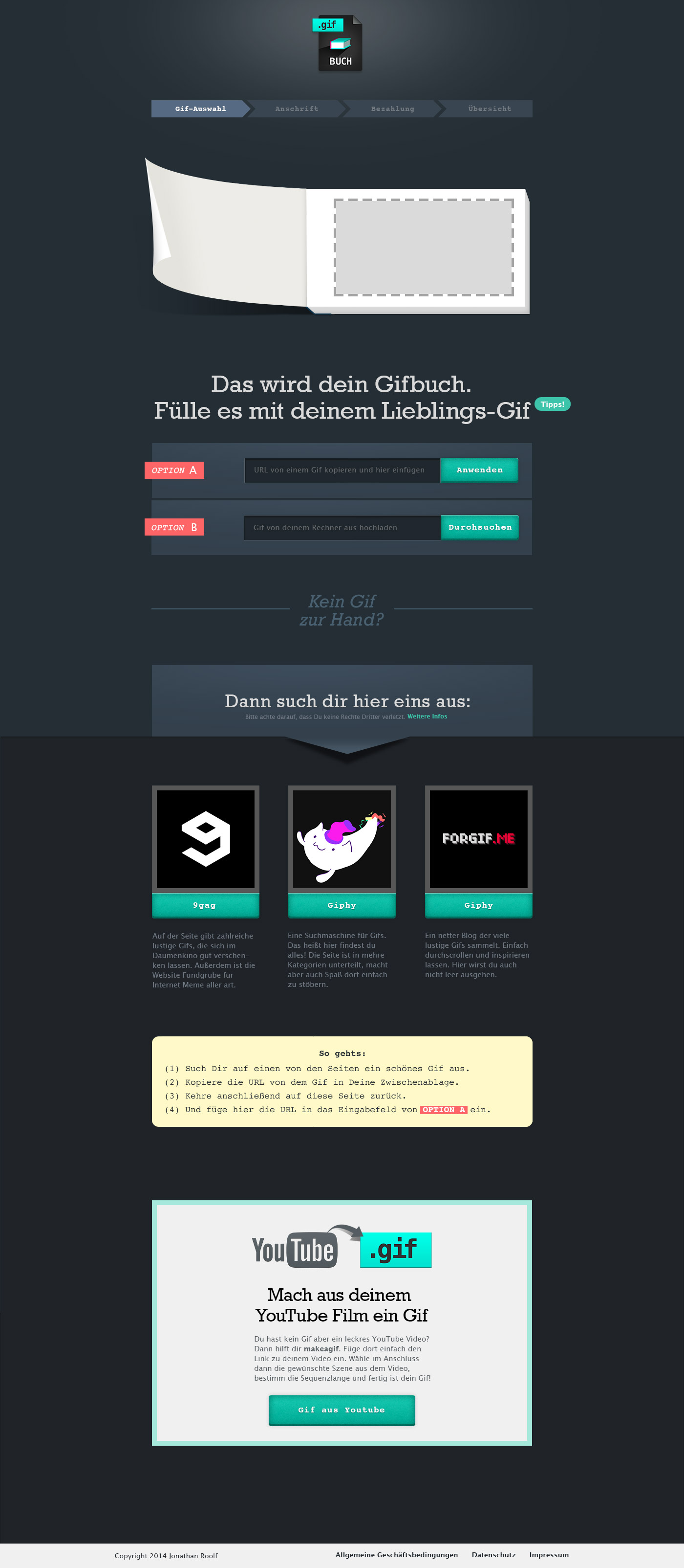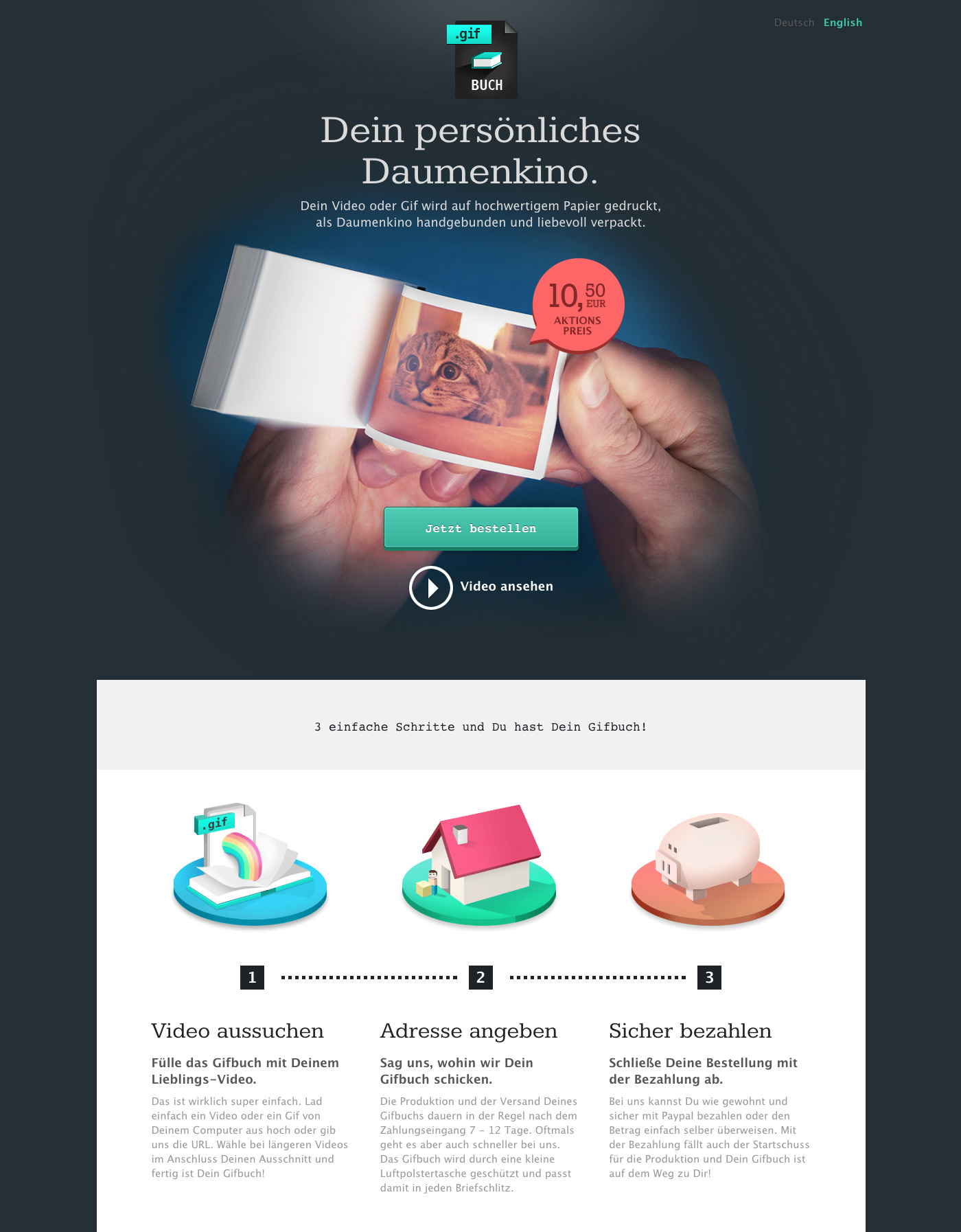 Über eine selber ins Leben gerufene Seite bot ich Nutzern die Möglichkeit eigene animierte Gifs oder Videos in ein haptisches Daumenkino umwandeln, dass ich zur Produktion an eine Hamburger Druckerei übergab. das Projekt Gifbuch erhielt viel mediale Aufmerksamkeit. Das Design der Daumenkinos wurde ausgezeichnet. Neben der Website gestaltet ich in diesem Projekt auch eigene Werbemittel (Flyer, Poster, Anzeigen) und natürlich auch das Aussehen der Daumenkinos.